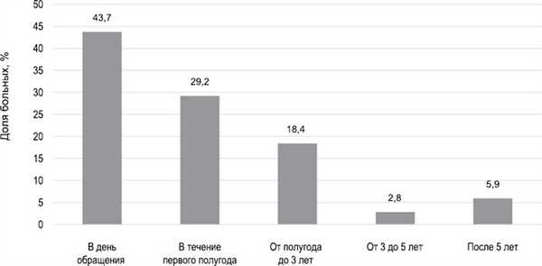 Рис. 1. Распределение больных по временным интервалам от момента первого обращения к врачу до момента установления диагноза.