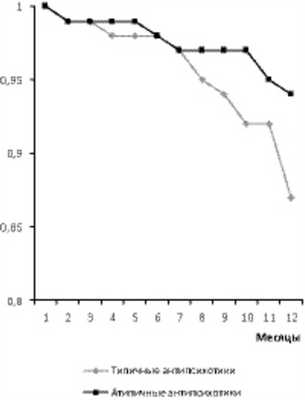 При оценке эффективности применения типичных и атипичных нейролептиков по доле пациентов без последующего рецидива болезни было установлено, что длительность безрецидивного периода в группе пациентов, получающих атипичные антипсихотики, была достоверно (р<0,05) больше, а комплайенс выше по сравнению с препаратами 1-го поколения (см. рисунок). Рисунок 1. Кумулятивная пропорция безрецидивного периода терапии (ось ординат) у пациентов по группам антипсихотических средств.