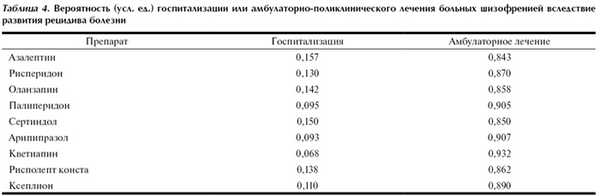 Вероятность госпитализации или амбулаторно-поликлинического лечения больных шизофренией вследствие развития рецидива представлена в табл. 4.