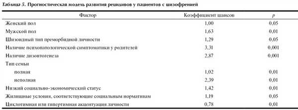 В настоящем исследовании нами также изучались прогностические факторы развития рецидива шизофрении с острой психотической симптоматикой у больных. Статистический анализ факторов, детерминирующих развитие рецидива у пациентов с верифицированным диагнозом шизофрении, был проведен с помощью метода логистической регрессии. Установлено, что рецидив достоверно (р<0,05) предопределяется целым рядом взаимодействующих демографических, социальных и экономических факторов (табл. 5). При этом критическим значением развития рецидивов у обследуемых пациентов является суммарное значение коэффициентов шансов более 6,03.