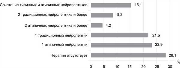 Большинство больных шизофренией после установления диагноза получали соответствующую психофармакологическую терапию. Ее структура и число больных (в %) при разных вариантах лечения приведены на рис. 4.