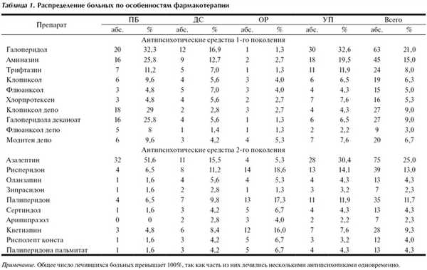 Распределение больных шизофренией по получаемой фармакотерапии представлено в табл. 1. Из нее видно, что из современных нейролептиков наиболее часто назначают азалептин, рисперидон, палиперидон. При этом обращает на себя внимание тот факт, что если современные препараты, т.е. нейролептики 2-го поколения, назначаются большей частью в виде монотерапии или в комбинациях с антидепрессантами и транквилизаторами, то в терапии препаратами 1-го поколения чаще используются комбинации антипсихотиков.