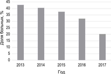 Рис. 3. Показатели назначения инвалидности у больных с впервые установленной шизофренией с 2013 по 2017 г.г.