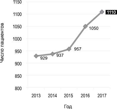 Распределение больных с впервые диагностированной шизофренией по годам представлено на рис. 2. Как видно из рисунка, с 2013 г. отмечалось постепенное увеличение числа больных с впервые установленным диагнозом «шизофрения», в том числе за последние 2 исследованных года. Следует подчеркнуть, что данные за 2017 г. анализировались лишь за 9 истекших месяцев года. Поэтому есть основание предположить, что число пациентов с впервые установленным диагнозом за весь год составило бы около 1110 (на рис. 2 эта цифра дана в квадрате на темном фоне).