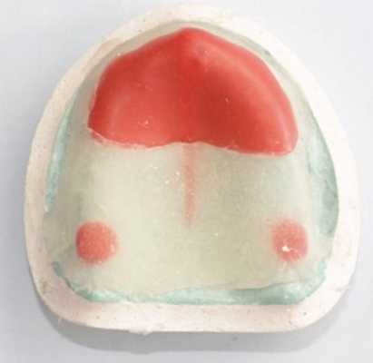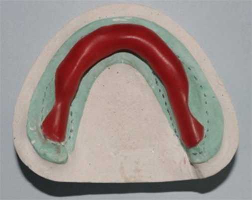 В данной методике прикусные окклюзионные валики перераспределяют избыточное пальцевое давление, оказываемое на адентичные альвеолярные гребни, обеспечивая тем самым функциональное взаимоотношение между зубами и адентичными гребнями. Полученный оттиск заливают гипсом (Silky-Rock, Whip Mix, Louisville, KY).
