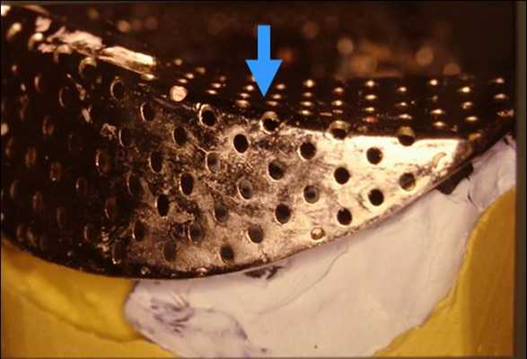 Фото 11: Индивидуальная ложка на нижнюю челюсть. Изолирующий воск удален. В зоне гребня в ложке сделаны разгружающие отверстия.