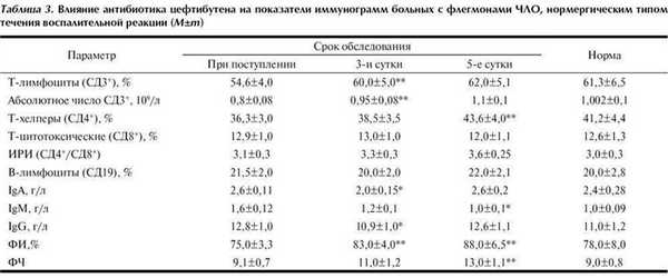 Полученные данные явились основанием для назначения цефтибутена в качестве препарата для антибактериальной химиотерапии по 400 мг/сут перорально на 5 дней послеоперационного периода. После лечения наблюдали благоприятную динамику всех клинических параметров (выраженность болевого синдрома, экссудация, репарация, сроки снятия швов). К числу основных лабораторных критериев эффективности лечения относились иммунологические препараты крови пациентов (табл. 3).