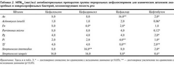 Очевидно, что минимальная подавляющая концентрация (МПК) цефтибутена по сравнению с аналогами для перорального применения (цефалексин, цефадроксил, цефаклор) была достоверно ниже в отношении всех исследуемых штаммов и составляла в наших исследованиях от 0,06 до 4,0 мкг/мл. Последнее объясняется расширенным в сравнении с таковым у аналогов 1-й и 2-й группы для перорального приема спектром препарата, который относится к группе цефалоспоринов III поколения. Помимо анаэробных пародонтопатогенных бактерий, к нему проявляли высокую чувствительность микроаэрофильные бактерии - Aa, Steptococcus sanguis и Streptococcus intermedius (табл. 2).