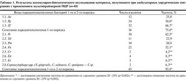 При проведении молекулярно-биологических исследований нами была проанализирована частота обнаружения представителей бактериальных видов пародонтопатогенной группы 1-го и 2-го порядка в раневом экссудате, полученном у пациентов при амбулаторном хирургическом лечении (цистэктомия, удаление 3 моляра) - табл. 1.