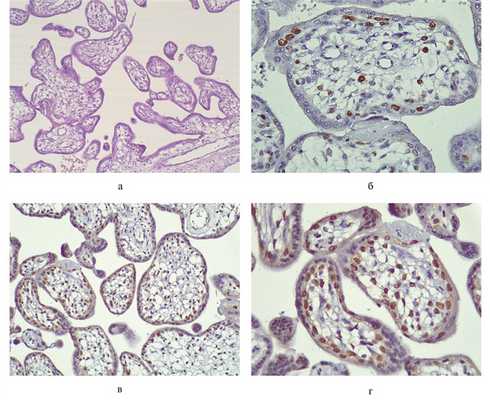 Рис. 2. Плацента нормального строения. а — промежуточные недифференцированные и формирующиеся дифференцированные ворсины с немногочисленными узкими сосудами; б — позитивная реакция с Ki-67 в немногочисленных клетках стромы и клетках цитотрофобласта ворсин; в, г — позитивная ядерная реакция с р57 в клетках стромы и ворсинчатом цитотрофобласте.