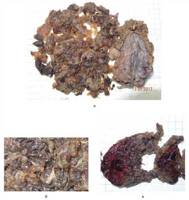 На исследование направлены плод и послед. Плод мужского пола массой 127 г (норма для срока беременности 16—17 нед 130—180 г), теменно-копчиковый размер 12 см (норма 10—11 см) правильного телосложения, пороков развития не выявлено. Послед в виде фрагментов общей массой 517 г (при норме 80—100 г). Один из фрагментов массой 85 г представлен тканью плаценты размером 11×5×1 см со сформированной хориальной пластинкой, по периферии с дефектами ткани, с центрально прикрепленной пуповиной диаметром 0,3 см, содержащей 3 сосуда (рис. 1, а). Базальная пластинка утолщена, светло-серая, паренхима отечная, бледная. Остальная часть плаценты представлена гроздевидными скоплениями пузырьков диаметром 0,2—0,6 см, диаметр отдельных пузырьков превышал 3 см (см. рис. 1, б), на разрезе определяются обширные тромбы с участками разной давности, наибольший из них диаметром 4 см (см. рис. 1, в).