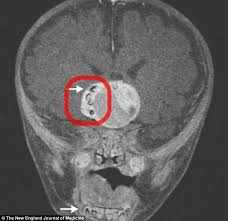 Полностью сформированные молочные зубы оказались в мозге малыша, при том, что во рту у него еще ничего не прорезывалось. Это первый случай в истории медицины. Есть версии о связи развитии опухолевого образования и патологии, но скорее всего — это необычный вариант близнеца-паразита, тератома, формировавшаяся в такой странной манере.