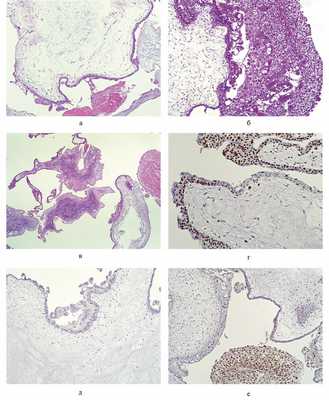Часть последа с кистозной трансформацией микроскопически представлена крупными отечными ворсинами, в большинстве из которых определяются полости (цистерны), в некоторых ворсинах спавшиеся, и небольшим числом ворсин среднего диаметра с отечной стромой без образования полостей. Сосуды в ворсинах отсутствуют. Выражена пролиферация трофобласта местами с образованием криброзных и сосочковых структур, а также умеренным полиморфизмом клеток (рис. 3, а, б). Встречаются группы некротизированных ворсин, преимущественно располагающиеся вблизи тромбов (см. рис. 3, в). ИГХ-реакция с р57 в трофобласте и строме ворсин отрицательная, во вневорсинчатом трофобласте положительная (см. рис. 3, д, е). Реакция с Ki-67 позитивная в большинстве клеток цитотрофобласта ворсин и во вневорсинчатом трофобласте (см. рис. 3, г).