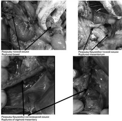 При динамическом наблюдении отмечено нарастание явлений геморрагического шока. С учетом клинико-инструментальной картины заболевания закрытой травмы живота с повреждением внутренних органов и продолжающимся внутрибрюшным кровотечением в экстренном порядке выполнена лапаротомия. Во время доступа в брюшную полость выявлено, что кожа и подкожная клетчатка полностью отсепарированы от подлежащего слоя прямых и косых мышц, имбибированных кровью из-за размозжения (межмышечная гематома) на всем протяжении доступа. Множественные более мелкие гематомы в подкожной клетчатке. В брюшной полости во всех отделах большое количество крови и сгустков (1800 мл), кровь аспирирована с помощью аппарата CellSaver. Продолжающегося активного кровотечения не выявлено. При ревизии органов брюшной полости: в проекции V—VI сегментов правой доли печени по краю выявлена подкапсульная гематома размером около 6×2 см, не пульсирующая, в объеме за время операции не увеличилась. Других повреждений печени по диафрагмальной и висцеральной поверхностям не установлено; на расстоянии 30, 40 и 45 см от связки Трейца 3 разрыва стенки тощей кишки с вскрытием просвета и 1 десерозированный участок. В области разрывов кишки также отмечены участки повреждения брыжейки тонкой кишки (рис. 3), Рис. 3. Разрывы петель тонкой и толстой кишки (интраоперационные фотографии). откуда продолжалось кровотечение. На расстоянии 60 см от связки Трейца выявлен полный поперечный разрыв тощей кишки с разрывом брыжейки кишки до уровня ее корня и активно продолжающимся кровотечением из сосудов брыжейки. Гематома в области брыжейки поперечной ободочной кишки, просвет кишки не вскрыт, гематома в размерах не увеличивается. Помимо этого гематома околокишечной клетчатки вдоль нисходящей ободочной кишки и сигмовидной кишки, брыжейка которой на уровне дистальной трети разорвана; сама сигмовидная кишка в области разрыва брыжейки не изменена, спастически сокращена, просвет не вскрыт, серозная оболочка обычной окраски с небольшими петехиальными кровоизлияниями из-за травмы. Обширная забрюшинная гематома по левому латеральному каналу с распространением на парааортальное клетчаточное пространство и корень брыжейки тонкой кишки. Париетальная брюшина в области левого латерального канала также разорвана, визуализирован левый мочеточник, без повреждений (моча концентрированная, макрогематурии нет). В области боковой стенки живота со стороны париетальной брюшины разрыв стенки размером около 10×5 см с повреждением прямых и косых мышц живота и продолжающимся низкоинтенсивным кровотечением из мышечных сосудов.