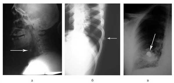 Поверхностные раны шеи требовали первичной хирургической обработки с экономным иссечением их краев. Инородных тел в тканях при этом не выявлено. При глубоком ранении (что определялось по внешнему виду раны) для исключения повреждения органов и структур шеи выполняли обзорную рентгенографию (рис. 4, а), Рисунок 4. Обзорные рентгенограммы пострадавших с ранениями из травматического оружия. Стрелками указаны инородные тела (пули). а - при ранении шеи; б - при непроникающем ранении груди; в - при проникающем ранении груди. затем продольную переднюю колотомию (21 наблюдение). При этом в 1 наблюдении обнаружено ранение трахеи и в 2 - повреждение ротоглотки. Инородные тела извлечены в 10 наблюдениях (пули из пистолета «Макарыч» - в 6, из «Осы» - в 4). Хирургическая обработка раневого канала являлась заключительным этапом вмешательства.