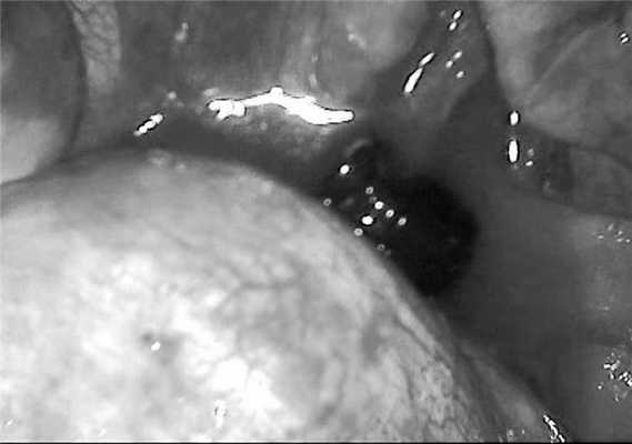 У 13 раненых огнестрельные повреждения груди были проникающими (рис. 4, в). При отсутствии показаний к торакотомии вмешательство ограничивали первичной хирургической обработкой и дренированием плевральной полости (7 наблюдений). Несмотря на проникающие ранения, при рентгенологическом исследовании инородных тел (пуль) в этих наблюдениях выявлено не было. Двум больным этой группы в отсроченном порядке была выполнена торакоскопия в связи с выявленным инородным телом легкого или плевральной полости на рентгенограмме груди в послеоперационном периоде. В одном из этих наблюдений выполнены пневмотомия и удаление резиновой пули калибра 18 мм, ушивание раны легкого П-образными швами, санация и дренирование плевральной полости. В другом наблюдении резиновая пуля калибра 18 мм лежала в заднем костно-диафрагмальном синусе слева (рис. 5), Рисунок 5. Фотография при торакоскопии: в заднем синусе левой плевральной полости видна резиновая пуля калибра 18 мм. произведены ее удаление, санация и дренирование плевральной полости.