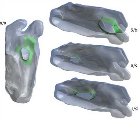 4) перфорация в костном отделе носовой перегородки на том же уровне размерами 20 мм (рис. 1). Рис. 1. Рабочие модели на этапе 3-D моделирования. а — перфорация в переднем отделе носовой перегородки на уровне переднего конца нижней носовой раковины размерами 10 мм; б — перфорация в переднем отделе перегородки носа на том же уровне размерами 20 мм; в — перфорация в костном отделе носовой перегородки на уровне прикрепления нижней носовой раковины размерами 10 мм; г — перфорация в костном отделе носовой перегородки на том же уровне размерами 20 мм.