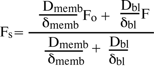 Исходя из того, что δmemb — это толщина слизистой оболочки, речь идет об упрощенной модели слизистой оболочки без учета желез и ресничек мерцательного эпителия; F0 — массовая доля воды на внутренней поверхности слизистой оболочки полости носа, принятая за константу, которую обеспечивает капиллярная сеть; Fs — массовая доля воды на наружной поверхности слизистой оболочки полости носа.