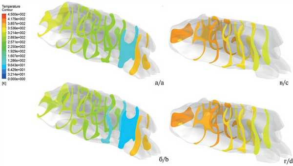 Тем не менее основная цель нашего исследования состоит в изучении таких характеристик, как температура и влажность вдыхаемого воздуха. Увеличение скорости воздушного потока негативно влияет на основные функции НП — согревание и увлажнение вдыхаемого воздуха, что наиболее ярко проявляется при увеличении размера дефекта: температура 33,1±0,3°C и 30,5±0,9°C и влажность 97±0,34% (34,26±1,16 г/м 3 ) и 93±0,7% (28,75±2,01 г/м 3 ) при дефектах размерами 10 мм и 20 мм соответственно (рис. 3). Рис. 3. Температурные значения вдыхаемого воздуха. Модели носовой полости: а — модель носовой полости с перфорацией в переднем отделе носовой перегородки на уровне переднего конца нижней носовой раковины размерами 10 мм; б — модель носовой полости с перфорацией в переднем отделе перегородки носа на том же уровне размерами 20 мм; в — модель носовой полости с перфорацией в костном отделе носовой перегородки на уровне прикрепления нижней носовой раковины размерами 10 мм; г — модель носовой полости с перфорацией в костном отделе носовой перегородки на том же уровне размерами 20 мм.