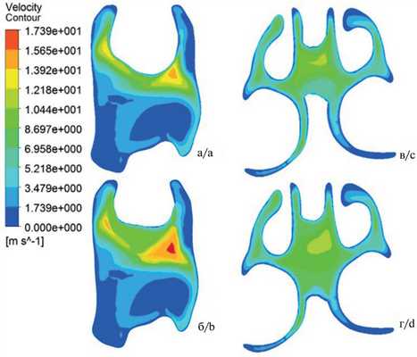 Перфорация перегородки носа нарушает одну из главных функций перегородки носа — обеспечение раздельного дыхания, что делает невозможным попеременную работу двух половин носа, иначе — существование носового цикла. Дефект в перегородке носа приводит к патологическому воздушному обмену. Для наглядности патологического воздухообмена представлены аэродинамические модели в виде срезов на уровне центральной части перфорации (рис. 2). Рис. 2. Объем патологического воздухообмена и скоростные показатели. Представлены срезы на уровне центральной части перфорации. а — перфорация в переднем отделе носовой перегородки на уровне переднего конца нижней носовой раковины размерами 10 мм; б — перфорация в переднем отделе перегородки носа на том же уровне размерами 20 мм; в — перфорация в костном отделе носовой перегородки на уровне прикрепления нижней носовой раковины размерами 10 мм; г — перфорация в костном отделе носовой перегородки на том же уровне размерами 20 мм.