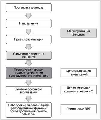 В рекомендациях Американского общества репродуктивной медицины (ASRM) также говорится, что если заинтересованные пациенты не будут направлены на консультацию к репродуктологу перед проведением лечения, варианты для последующей реализации репродуктивной функции могут быть утрачены [22—23].