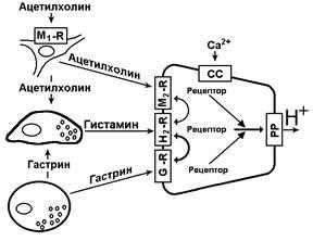 Предполагается, что существует сильное обязательное взаимодействие между рецепторами гистамина и гастрина и более слабое, необязательное, - между рецепторами гистамина и ацетилхолина.
