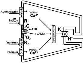 Предполагают, что в результате действия гастрина и ацетилхолина с рецепторами повышается внутриклеточная концентрация Ca 2+ , гистамина — увеличение образования цАМФ [91] .