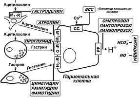 Соляная кислота продуцируется обкладочными (париетальными) клетками слизистой желудка, которые составляют 20% от общей массы слизистой. В обкладочных клетках до 44% объема занимают митохондрии, вокруг которых скапливаются гранулы гликогена и капли жира (запасы энергетических субстратов). Процесс синтеза соляной кислоты запускается через нейрогуморальные механизмы регуляции, опосредованные медиаторами и гормонами - ацетилхолином, гистамином, гастрином. Ацетилхолин действует на париетальные клетки прямо и опосредованно. Прямой путь действия ацетилхолина осуществляется за счет взаимодействия медиатора с рецепторами на базолатеральной мембране клетки. Непрямой путь действия ацетилхолина связан с воздействием на специализированные клетки слизистой желудка, вырабатывающие гастрин и гистамин. Гастринпродуцирующие клетки локализованы в основном в пилорической части желудка. Рецепторы для гастрина локализованы на гистаминпродуцирующих и обкладочных клетках. Гистаминпродуцирующие клетки локализованы в фундальной части желудка и содержат рецепторы к гастрину. При действии гастрина повышается активность декарбоксилазы гистидина, превращающей его в гистамин. Секреция гистамина стимулируется кальцием (Са 2+ ).
