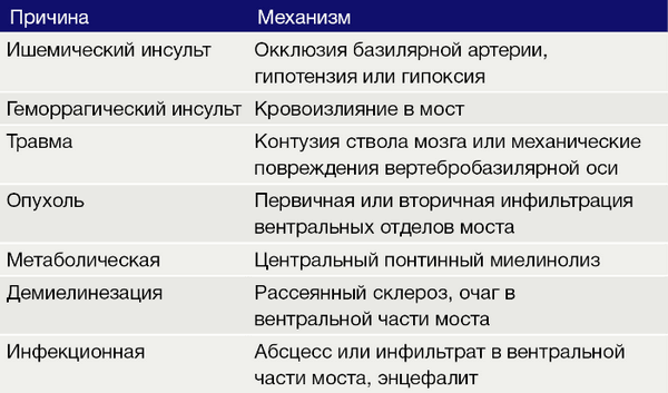 Таблица 1. Причины и механизмы развития синдрома запертого человека.