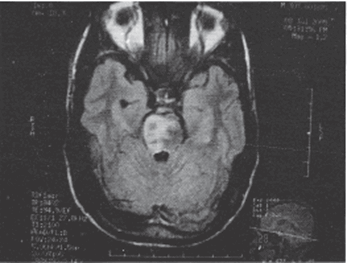 Рисунок 1. T2 Flair МРТ снимок, демонстрирующий билатеральный инфаркт моста (затронувший правую сторону больше, чем левую) (Paliwal et al., 2007)