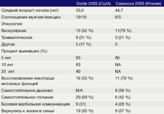 В таблице представлены результаты двух исследований, оценивающих продолжительность жизни пациентов с синдромом запертого человека, и процент пациентов, восстановивших некоторые моторные функции [4, 5].