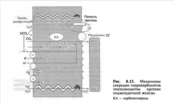 Гуморальная регуляция. Первым открытым (и на званным гормоном) явился секретин — стимулятор обильного сокоотделения и секреции гидрокарбонатов. Высвобождение этого гормона в кровь S-клетками двенадцатиперстной кишки происходит при действии на ее слизистую оболочку перешедшего в кишку кислого желудочного содержимого. Секретин стимулирует секрецию в большей мере через соответствующие мембранные рецепторы и вторичные мессенджеры АЦ — цАМФ центроацинозные и протоковые клетки, в меньшей мере — ацинозные клетки, поэтому выделяется секрет с высокой концентрацией гидрокарбонатов и низкой ферментативной активностью.