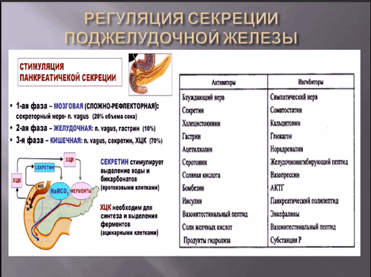 Регуляция поджелудочной экзокринной секреции осуществляется нервными и гуморальными механизмами. Блуждающий нерв усиливает секрецию поджелудочной железы. Симпатические нервы уменьшают количество секрета, но усиливают синтез органических веществ. Снижение секреции происходит также и за счет уменьшения кровоснабжения поджелудочной железы путем сужения кровеносных сосудов. Напряженная физическая и умственная работа, боль, сон вызывают торможение секреции. Гастроинтестинальные гормоны усиливают секрецию поджелудочного сока. Секретин стимулирует выделение сока, богатого бикарбонатами. Секрецию поджелудочной железы усиливают гастрин, серотонин, бомбезин, инсулин, соли желчных кислот. Тормозящее действие оказывают ЖИП, ПП, глюкагон, кальцитонин, соматостатин.