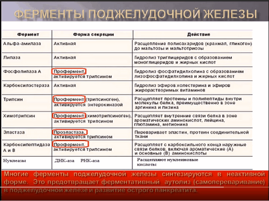 Протеолитические ферменты секретируются в виде проэнзимов - трипсиногена, химотрипсиногена, прокарбоксипептидазы А и В, проэластазы. Энтерокиназа превращает трипсиноген в трипсин. Затем сам трипсин действует автокаталитически на оставшееся количество трипсиногена и на другие пропептидазы, превращая их в активные ферменты. Трипсин, химотрипсин, эластаза расщепляют преимущественно внутренние пептидные связи белков пищи, в результате чего образуются низкомолекулярные пептиды и аминокислоты. Карбоксипепидазы А и В расщепляют С-концевые связи в белках и пептидах.
