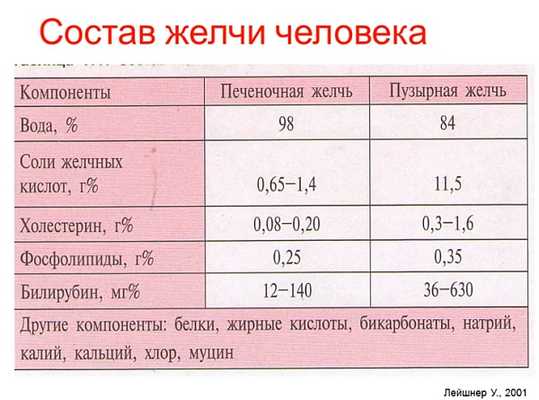 Желчь секретируется печенью с первого дня после рождения. В этот период желчь отличается максимальной концентрацией желчных кислот (2,0-26,7 мгэкв/л). К году концентрация желчных кислот снижается до 2,2-19,7 мгэкв/л. Концентрация желчных кислот в желчи 4-10-летних детей еще ниже — 2,4-5,2 мгэкв/л. У взрослых — 2,8-20,0 мгэкв/л. Биохимический состав желчи детей и подростков представлен в таблице (Козлов В.И., Фарбер и др., 1983):
