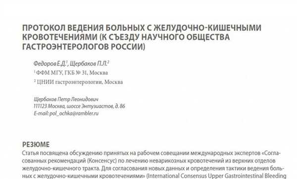 Статьи: ПРОТОКОЛ ВЕДЕНИЯ БОЛЬНЫХ С ЖЕЛУДОЧНО-КИШЕЧНЫМИ КРОВОТЕЧЕНИЯМИ (К СЪЕЗДУ НАУЧНОГО ОБЩЕСТВА ГАСТРОЭНТЕРОЛОГОВ РОССИИ)