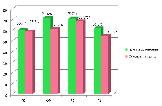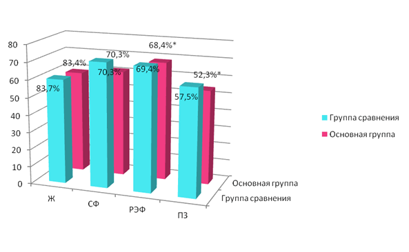 Как видно из данных, представленных на рис. 1, полученные результаты в основной группе существенно не отличались от данных, полученных в группе сравнения. Все опрашиваемые хорошо переносили физические нагрузки, как тяжелые, так и умеренные, ни один из пациентов не утратил способности к самообслуживанию (шкала ФФ). Большинство пациентов не испытывали затруднений в профессиональной или повседневной деятельности, поэтому им не пришлось сократить время, затрачиваемое на работу или выполнение домашних дел. Подобные затруднения возникли лишь у 4 (13,3%) пациентов (шкала РФФ). Физическая боль снижала КЖ у 14 (46,6%) пациентов. Наиболее часто пациенты предъявляли жалобы на головные боли, боли в области сердца.