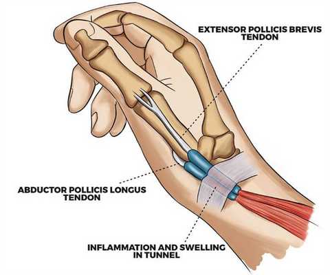Мышцы, пересекающие запястье, разделены на компартменты удерживателем разгибателей. В первом компартмете проходят сухожилия короткого разгибателя большого пальца кисти и длинной мышцы, отводящей большой палец кисти, чтобы затем прикрепиться дистально. Согласно Neumann, короткий разгибатель прикрепляется дистальнее к дорсальной стороне проксимальной фаланги и разгибательному механизму большого пальца, в то время как длинная мышца, отводящая большой палец прикрепляется дистальнее к радиально-дорсальной стороне 1-й пястной кости. Сочетание максимального сгибания пальцев и локтевого отведения кисти удлиняет эти сухожилия и вызывает боль у симптоматичных пациентов.