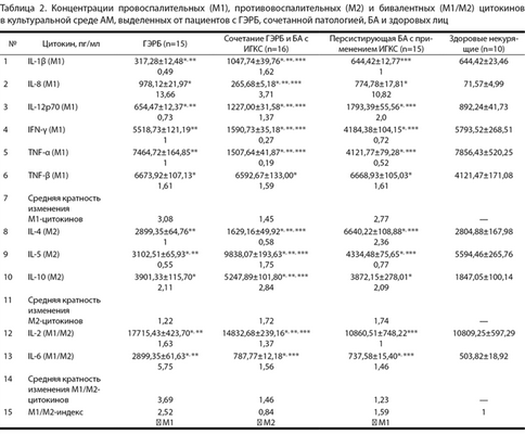 Таблица 2. Концентрации провоспалительных (М1), противовоспалительных (М2) и бивалентных (М1/М2) цитокинов в культуральной среде АМ, выделенных от пациентов с ГЭРБ, сочетанной патологией, БА и здоровых лиц