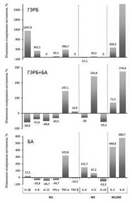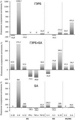 На рис. 1 изображена цитокиновая структура нарушенного иммунного ответа, при этом видно, что провоспалительный сдвиг при ГЭРБ связан с увеличением продукции цитокинов М1 IL-1β, IL-8, TNF-α и снижением продукции цитокина М2 IL-4, противовоспалительный сдвиг при БА — со снижением продукции цитокинов М1 IL-8, IL-12, IFN-γ, TNF-β и увеличением продукции цитокинов М2 IL-4 и IL-5, а противовоспалительный сдвиг при сочетанной патологии — со снижением продукции цитокинов М1 IL-1β, IL-8, IL-12, IFN-γ и увеличением продукции цитокина М2 IL-5. Наряду с наличием специфичности цитокиновой структуры при всех 3 заболеваниях обнаруживаются и общие черты: увеличение, хотя и в разной степени, содержания в БАЛЖ цитокинов TNF-α, IL-6 и IL-2 (см. рис. 1).