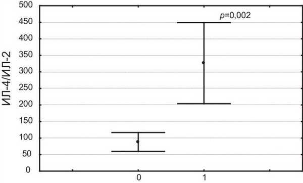 Для больных с ФЛ было характерно значительное повышение отношения ИЛ-4/ИЛ-2 в отличие от остальных пациентов (326,4±122,6 и 88,2±28,6% соответственно; р=0,002) (см. рисунок). Рисунок 1. Различие больных с признаками выраженного ФЛ (1) и пациентов с нефиброзными изменениями легочной паренхимы (0) по отношению ИЛ-4/ИЛ-2.