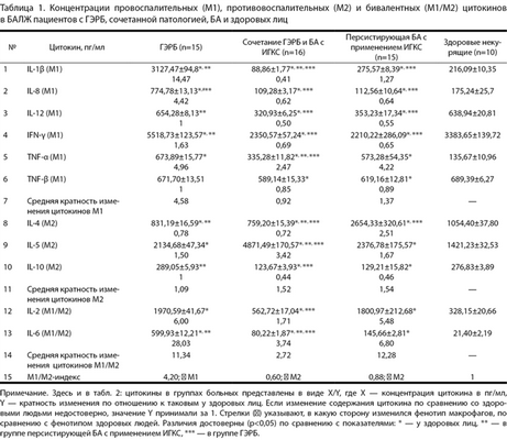 Таблица 1. Концентрации провоспалительных (М1), противовоспалительных (М2) и бивалентных (М1/М2) цитокинов в БАЛЖ пациентов с ГЭРБ, сочетанной патологией, БА и здоровых лиц