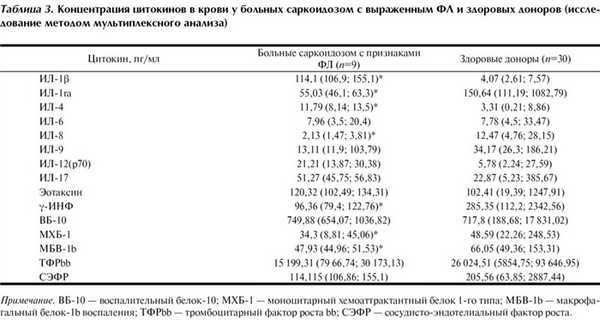 У больных саркоидозом с признаками ФЛ в отсутствие симптомов воспалительной активности заболевания обнаруживаются повышение уровня провоспалительного цитокина ИЛ-1 и снижение количества антагониста рецепторов к ИЛ-1 в периферической крови, что свидетельствует о сохраняющейся активности текущего гранулематозного воспаления.