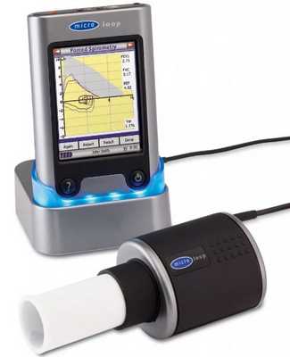 Небольшой по размерам, но внушительный по своим измерительным функциям портативный спирометр от Micro Loop. Прибор состоит из двух частей - блока управления с цветным монитором и двунаправленного датчика. Модель обладает широкими возможностями для измерений основных параметров, с ее помощью определяется и фиксируется 13 характеристик вдоха и выдоха. Примечательно, что не нужно каждый раз проверять калибровку прибора (он не ощущает перепадов влажности и температуры), но периодическая калибровка все-таки нужна. Для удобства использования прибор оснащен цветным монитором с высоким разрешением. Управление прибором и выбор функций осуществляется с помощью микро-мыши или стилуса. Связь с компьютером осуществляется через микро-USB разъем. Программное обеспечение PC Spirometry обеспечивает анализ и интерпретацию полученных при исследованиях данных, но, стоит отметить, в базовую комплектацию не входит. Встроенная память рассчитана на 2500 тестов. Большим преимуществом модели является встроенный анимированный текст для проведения спирометрии у детей. Работает от аккумуляторной батареи, которая подзаряжается через док-станцию от сети 220 В.