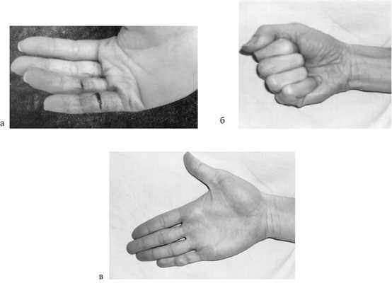 Рис. 2. Вид кисти до операции (а) и функциональный результат после восстановления глубокого сгибателя V пальца правой кисти с использованием первичного фиксационно-адаптационного сухожильного шва (б, в).