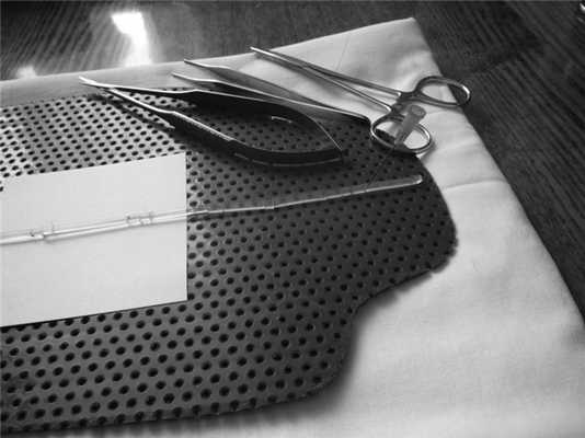 Стержень пересекаем скальпелем в поперечном или косом направлении, имитируя ранение сухожилия. При этом получается близкая к реальности имитация ранения сухожилия с небольшим диастазом концов пересеченного стержня. С помощью пинцета, иглодержателя, ножниц, атравматических игл 3/0, 4/0 курсант накладывает основной сухожильный шов, затем используя более тонкий шовный материал 6/0, накладывает адаптирующий шов. На одном стержне длиной 40 см можно наложить более 20 швов.