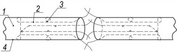 Рис. 1. Схема сухожильного фиксационно-адаптационного шва. 1 - конец сухожилия; 2 - лигатуры; 3 - петлеобразные узлы; 4 - наружная оболочка сухожилия.