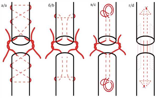 Рис. 1. Схемы традиционных сухожильных швов: Bunnell—Cuneo (а), Розова—Kessler—Tajima (б), Tsuge (в) и оригинального микрохирургического шва (г).