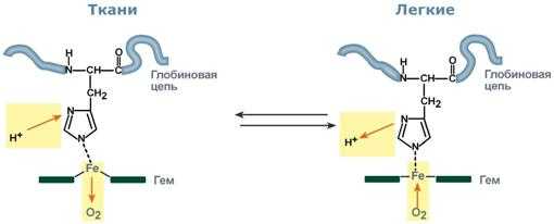 Изменение сродства гемоглобина к кислороду в тканях и в легких при изменении концентрации ионов H + и О2 обусловлено конформационными перестройками глобиновой части молекулы. В тканях ионы водорода присоединяются к остаткам гистидина, образуя восстановленный гемоглобин (H-Hb) с низким сродством к кислороду. В легких поступающий кислород "вытесняет" ион водорода из связи с остатком гистидина гемоглобиновой молекулы.