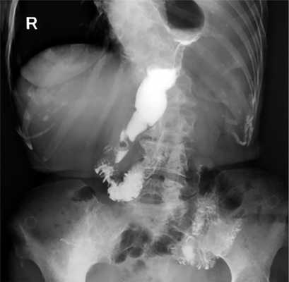 Рис. 4. Послеоперационная рентгенограмма пищевода и культи желудка больной Д., перенесшей проксимальную резекцию желудка с абдоминальным отделом пищевода.